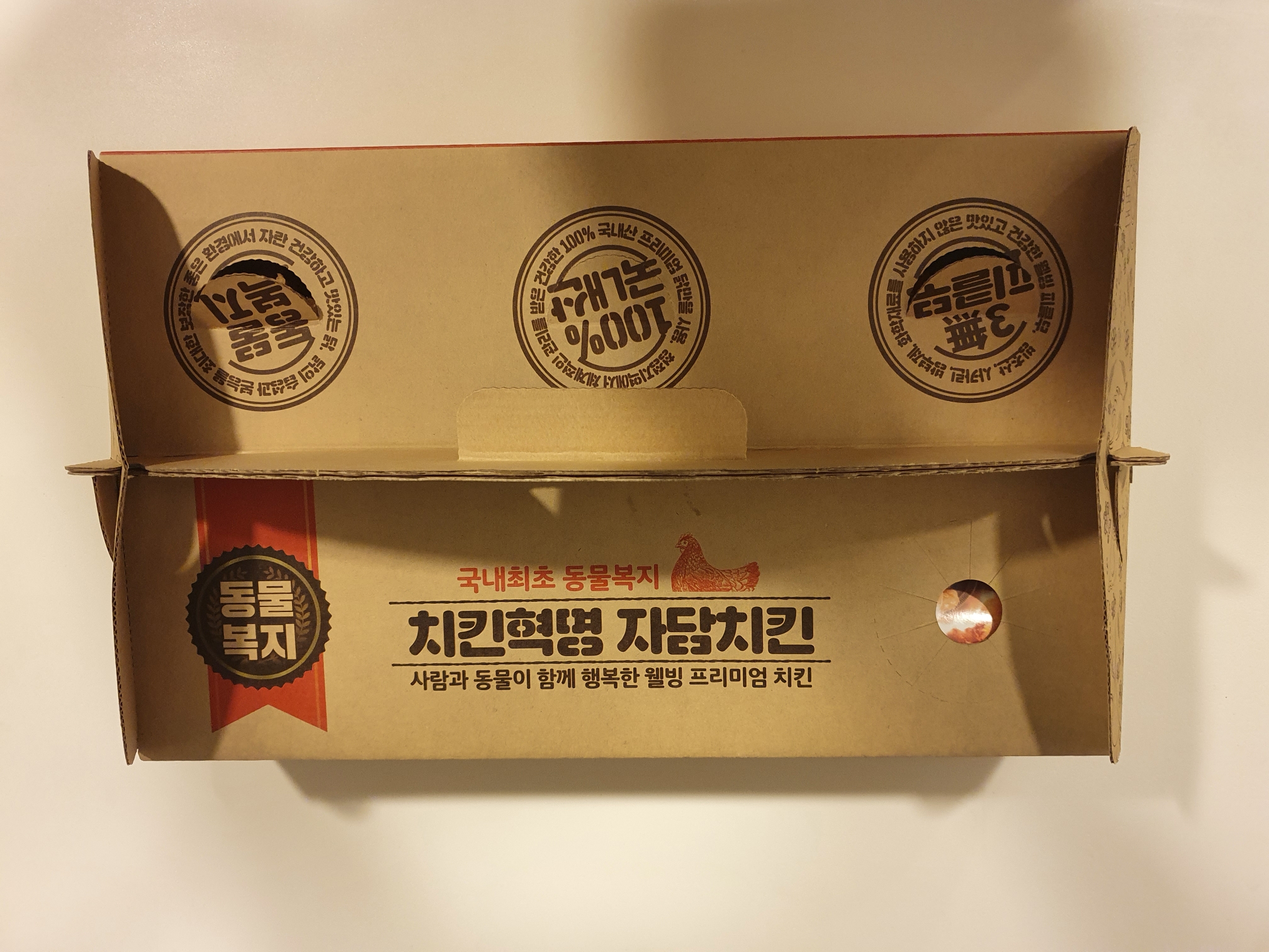 종이 상자에 포장되어 온 자담치킨