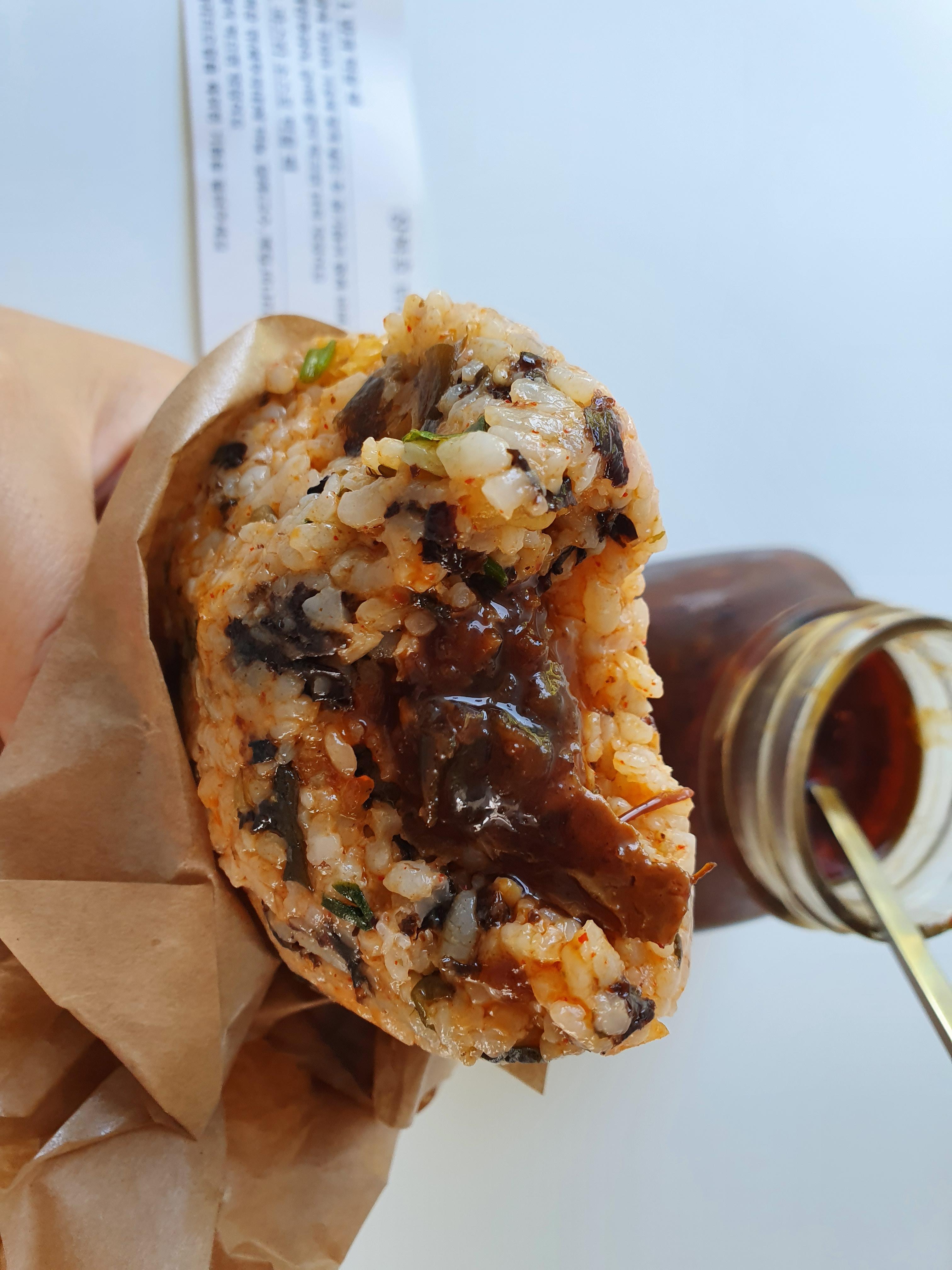 같이 구매해 온 주먹밥에 얹어 먹었는데