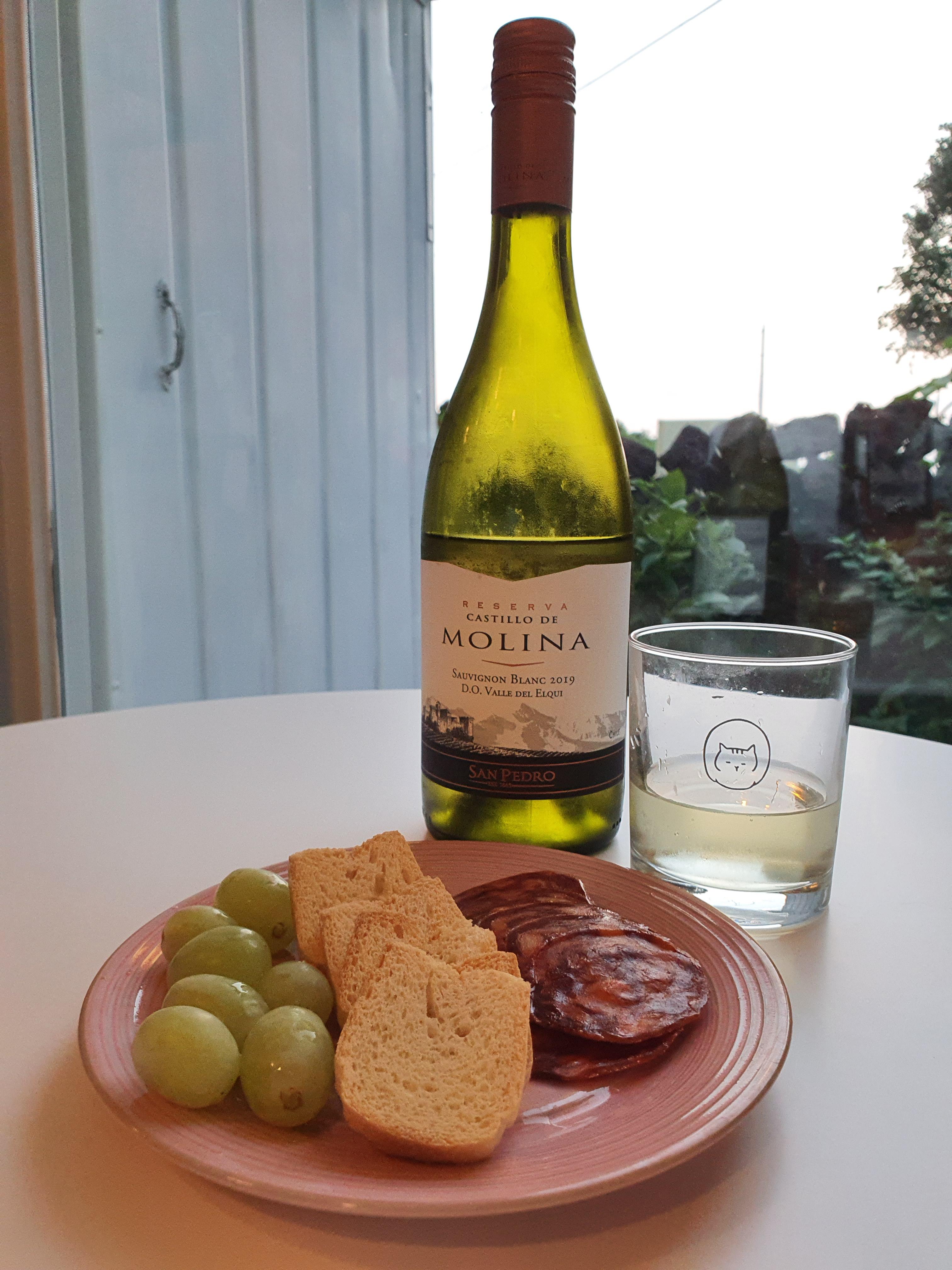 화이트 와인에 쵸리조, 청포도를 타파스에 얹어서