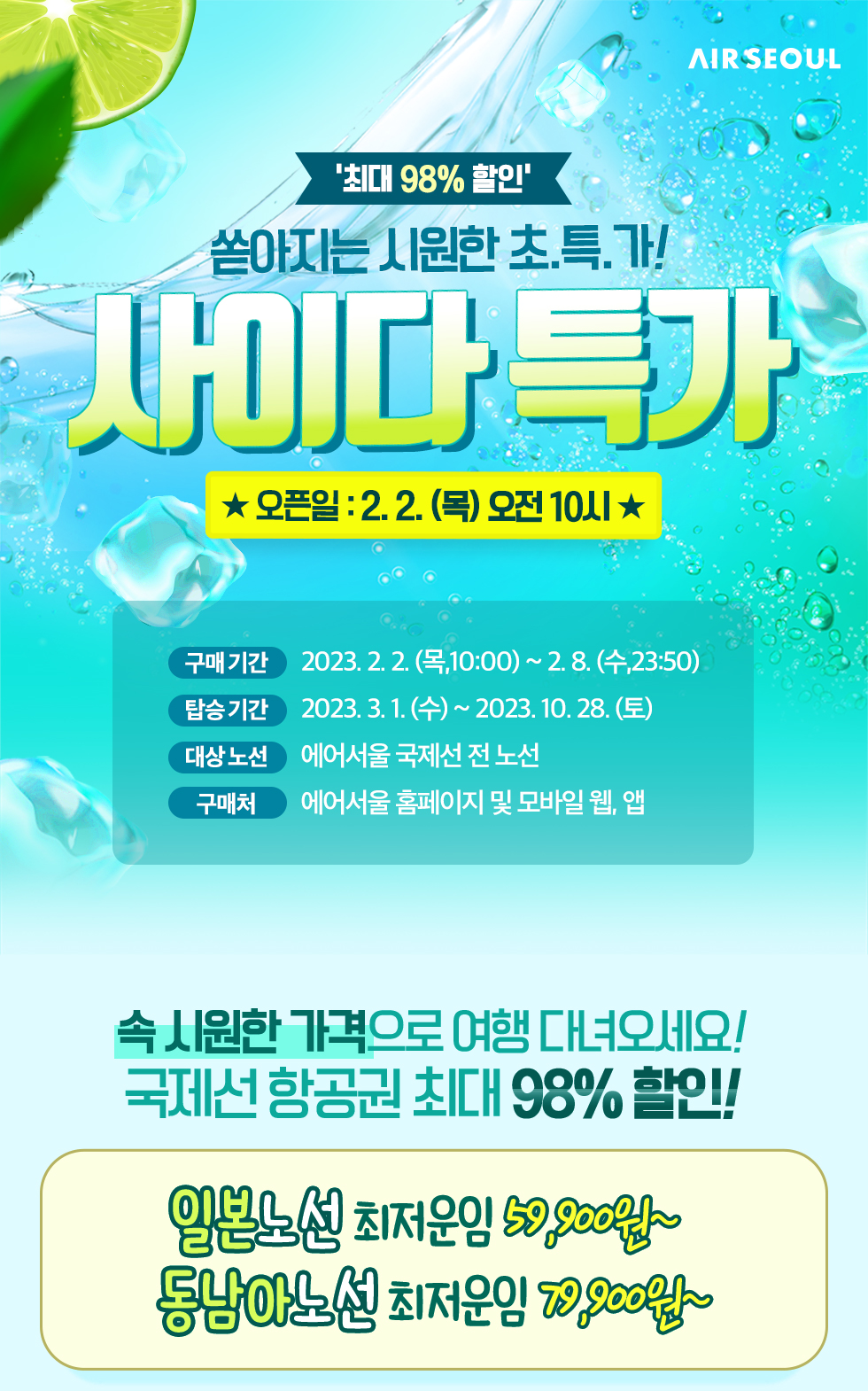 에어서울에서 1년에 단 2회만 실시하는 초특가 이벤트 사이다 특가를 오픈했다.