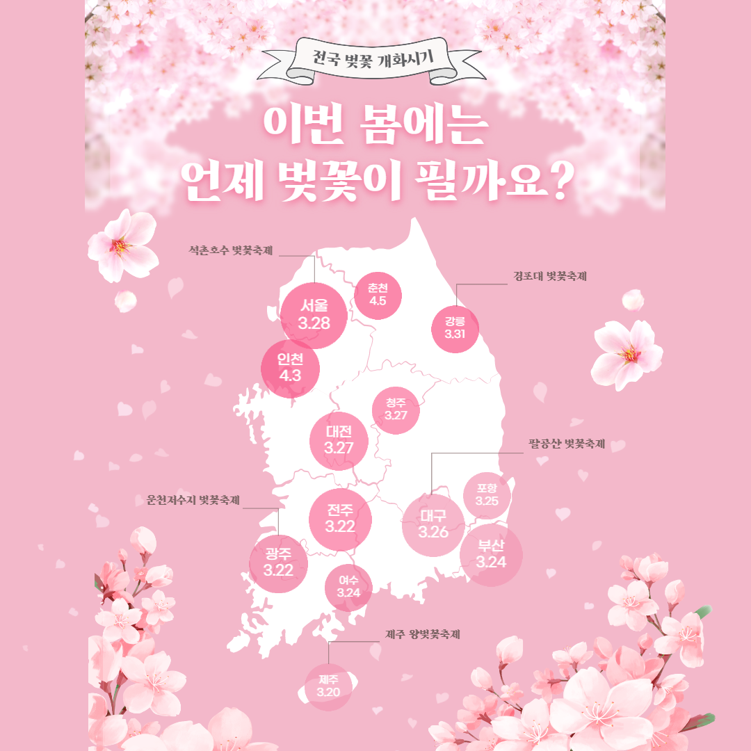 제주를 지나면 광주, 부산, 대구, 대전, 서울 방향으로 줄지어 꽃이 필 예정입니다. 유명한 벚꽃 축제가 열리는 진해 군항제와 부산 삼락 벚꽃축제, 대전의 대청호 벚꽃축제, 서울의 여의도 벚꽃 축제 등 몇년간 주춤했던 축제를 기다리며 얼마 남지 않은 겨울을 잘 보내야겠습니다.