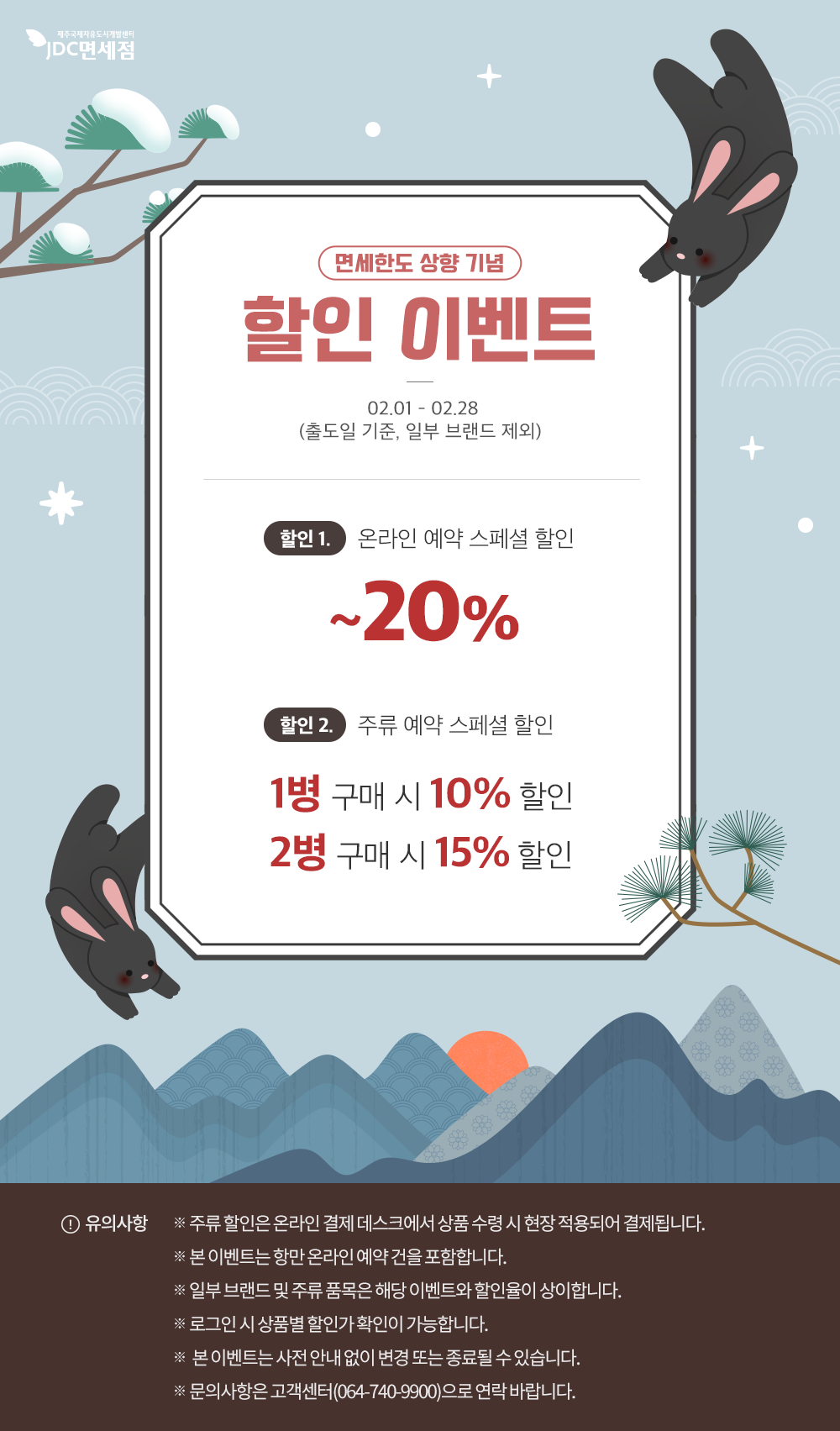 제주공항 면세점에서는 면세 한도 상향을 기념해 주류 구매시 할인 이벤트를 진행중입니다. 온라인으로 예약건에 한해 적용되며 1병 구매시 10% 2병 구매시 15% 할인됩니다.